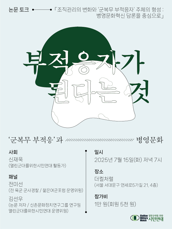 신촌문화정치연구그룹의 김선우 연구원이 지난 7월 15일 화요일 '열린 군대를 위한 시민연대'의 주최로 진행된 논문토크 <부적응자가 된다는 것 : '군복무 부적응'과 병영문화>에 패널로 참여했습니다. 해당 논문토크는 김선우 연구원의 석사논문을 토대로 진행되기도 했습니다.